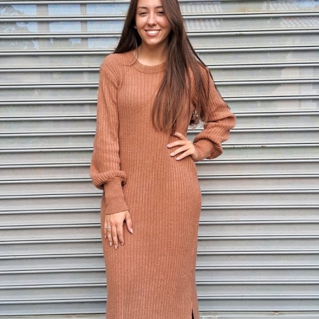 • VESTIDO CANELADO COM FENDA LATERAL E MANGA FOFA